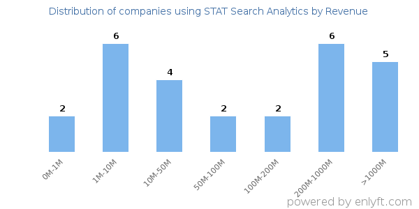 We have data on 28 companies that use STAT Search Analytics. The companies using STAT Search Analytics are most often found in United States and in the Marketing and Advertising industry. STAT Search Analytics is most often used by companies with 1000-5000 employees and 1M-10M dollars in revenue. Our data for STAT Search Analytics usage goes back as far as 8 years and 2 months.