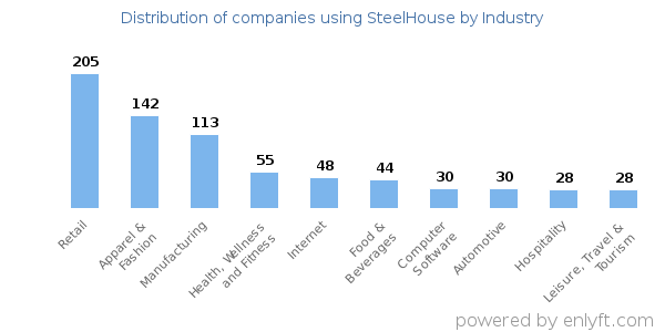 Looking at SteelHouse customers by industry, we find that Retail (15%), Apparel & Fashion (10%) and Manufacturing (8%) are the largest segments.
