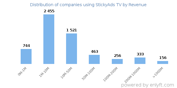 Of all the customers that are using StickyAds TV, a majority (72%) are small (<$50M), 7% are large (>$1000M) and 15% are medium-sized.