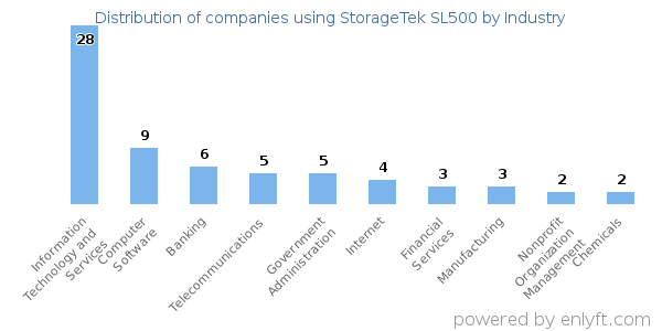 Looking at StorageTek SL500 customers by industry, we find that Information Technology and Services (27%), Computer Software (8%) and Banking (5%) are the largest segments.