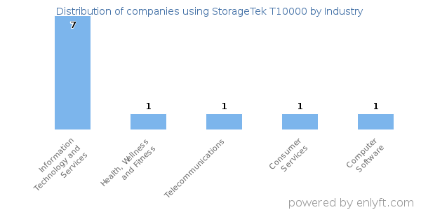 We have data on 11 companies that use StorageTek T10000. The companies using StorageTek T10000 are most often found in United States and in the Information Technology and Services industry. StorageTek T10000 is most often used by companies with >10000 employees and >1000M dollars in revenue. Our data for StorageTek T10000 usage goes back as far as 9 years and 7 months.
