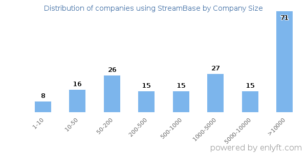 We have data on 194 companies that use StreamBase. The companies using StreamBase are most often found in United States and in the Financial Services industry. StreamBase is most often used by companies with >10000 employees and >1000M dollars in revenue. Our data for StreamBase usage goes back as far as 9 years and 9 months.