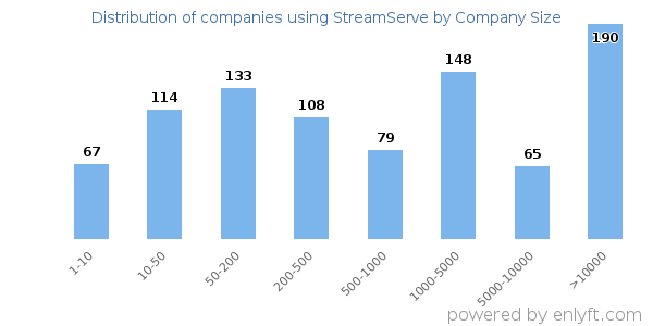 We have data on 928 companies that use StreamServe. The companies using StreamServe are most often found in United States and in the Information Technology and Services industry. StreamServe is most often used by companies with >10000 employees and >1000M dollars in revenue. Our data for StreamServe usage goes back as far as 9 years and 9 months.