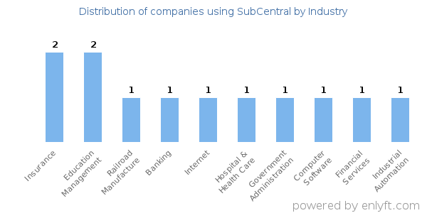 We have data on 21 companies that use SubCentral. The companies using SubCentral are most often found in United States and in the Insurance industry. SubCentral is most often used by companies with >10000 employees and >1000M dollars in revenue. Our data for SubCentral usage goes back as far as 8 years and 2 months.