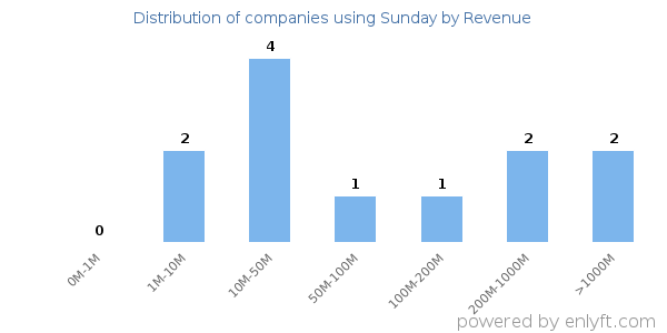 We have data on 12 companies that use Sunday. The companies using Sunday are most often found in United States and in the Financial Services industry. Sunday is most often used by companies with 50-200 employees and 10M-50M dollars in revenue. Our data for Sunday usage goes back as far as 4 years and 2 months.