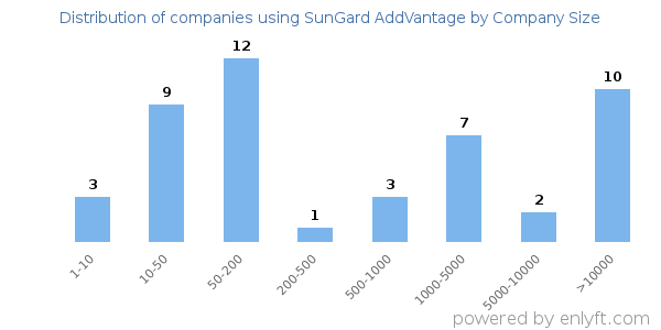 We have data on 49 companies that use SunGard AddVantage. The companies using SunGard AddVantage are most often found in United States and in the Financial Services industry. SunGard AddVantage is most often used by companies with 50-200 employees and >1000M dollars in revenue. Our data for SunGard AddVantage usage goes back as far as 9 years and 3 months.