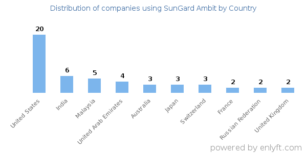 We have data on 61 companies that use SunGard Ambit. The companies using SunGard Ambit are most often found in United States and in the Banking industry. SunGard Ambit is most often used by companies with >10000 employees and >1000M dollars in revenue. Our data for SunGard Ambit usage goes back as far as 9 years and 3 months.