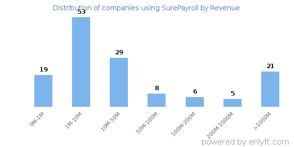 Of all the customers that are using SurePayroll, a majority (67%) are small (<$50M), 14% are large (>$1000M) and 6% are medium-sized.
