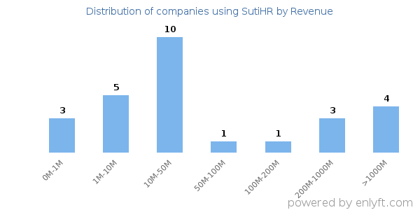 Of all the customers that are using SutiHR, a majority (56%) are small (<$50M), 19% are large (>$1000M) and 0% are medium-sized.