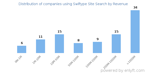 We have data on 99 companies that use Swiftype Site Search. The companies using Swiftype Site Search are most often found in United States and in the Computer Software industry. Swiftype Site Search is most often used by companies with 1000-5000 employees and >1000M dollars in revenue. Our data for Swiftype Site Search usage goes back as far as 8 years and 3 months.