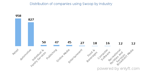 We have data on 2,591 companies that use Swoop. The companies using Swoop are most often found in United States and in the Retail industry. Swoop is most often used by companies with 10-50 employees and 10M-50M dollars in revenue. Our data for Swoop usage goes back as far as 8 years and 5 months.