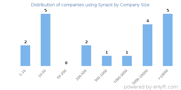 We have data on 20 companies that use Synack. The companies using Synack are most often found in United States and in the Information Technology and Services industry. Synack is most often used by companies with 10-50 employees and >1000M dollars in revenue. Our data for Synack usage goes back as far as 1 years and 8 months.