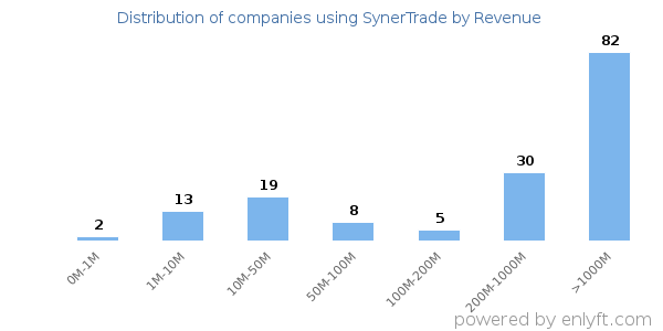 Of all the customers that are using SynerTrade, a majority (64%) are large (>$1000M), 20% are small (<$50M) and 6% are medium-sized.
