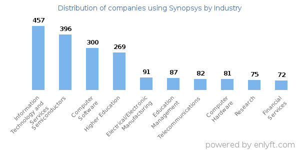 We have data on 3,229 companies that use Synopsys. The companies using Synopsys are most often found in United States and in the Information Technology and Services industry. Synopsys is most often used by companies with 50-200 employees and >1000M dollars in revenue. Our data for Synopsys usage goes back as far as 10 years and 1 months.