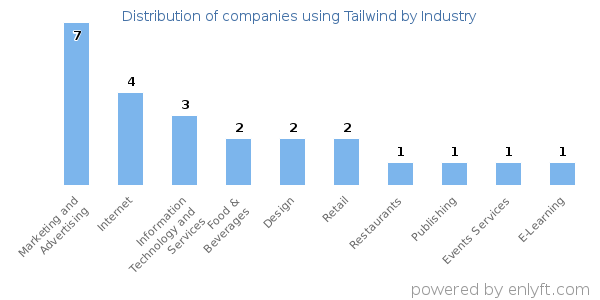 We have data on 33 companies that use Tailwind. The companies using Tailwind are most often found in United States and in the Marketing and Advertising industry. Tailwind is most often used by companies with 10-50 employees and 1M-10M dollars in revenue. Our data for Tailwind usage goes back as far as 6 years.