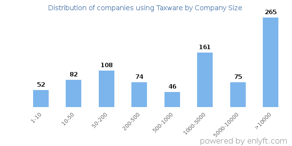 We have data on 873 companies that use Taxware. The companies using Taxware are most often found in United States and in the Information Technology and Services industry. Taxware is most often used by companies with >10000 employees and >1000M dollars in revenue. Our data for Taxware usage goes back as far as 10 years and 1 months.
