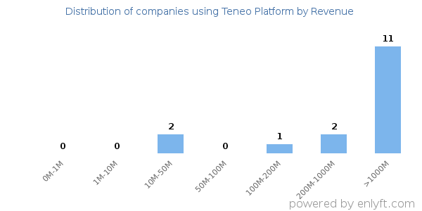 We have data on 18 companies that use Teneo Platform. The companies using Teneo Platform are most often found in United States and in the Information Technology and Services industry. Teneo Platform is most often used by companies with >10000 employees and >1000M dollars in revenue. Our data for Teneo Platform usage goes back as far as 8 years and 5 months.