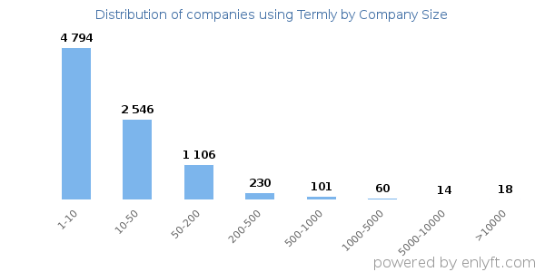 We have data on 11,202 companies that use Termly. The companies using Termly are most often found in United States and in the Computer Software industry. Termly is most often used by companies with 1-10 employees and 1M-10M dollars in revenue. Our data for Termly usage goes back as far as 5 years and 2 months.