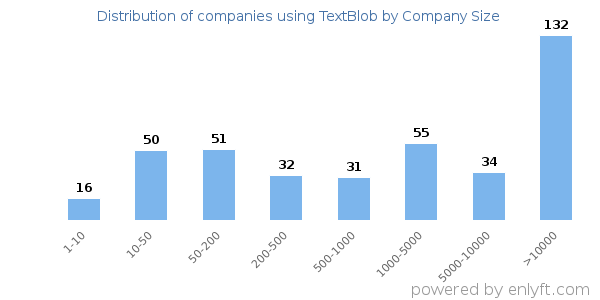 We have data on 408 companies that use TextBlob. The companies using TextBlob are most often found in United States and in the Higher Education industry. TextBlob is most often used by companies with >10000 employees and >1000M dollars in revenue. Our data for TextBlob usage goes back as far as 8 years and 3 months.