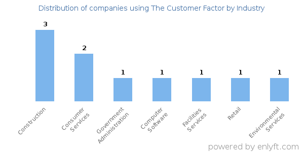 We have data on 10 companies that use The Customer Factor. The companies using The Customer Factor are most often found in United States and in the Construction industry. The Customer Factor is most often used by companies with 1-10 employees and 0M-1M dollars in revenue. Our data for The Customer Factor usage goes back as far as 8 years and 5 months.