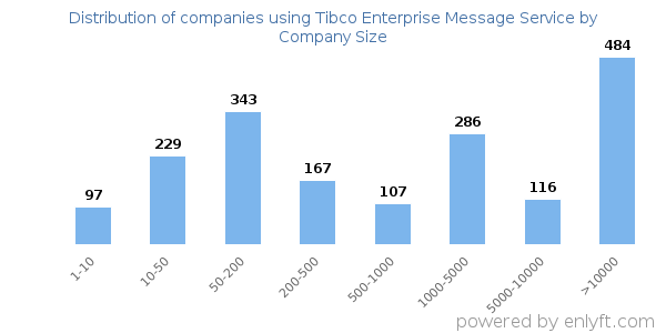 We have data on 1,864 companies that use Tibco Enterprise Message Service. The companies using Tibco Enterprise Message Service are most often found in United States and in the Information Technology and Services industry. Tibco Enterprise Message Service is most often used by companies with >10000 employees and >1000M dollars in revenue. Our data for Tibco Enterprise Message Service usage goes back as far as 10 years and 2 months.