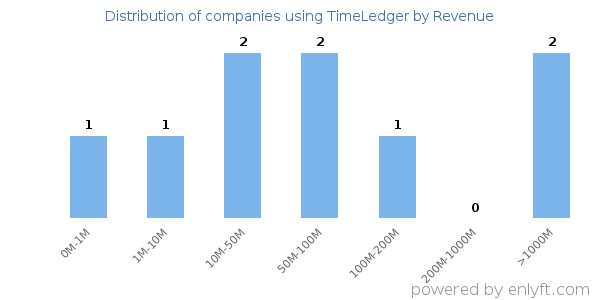 Of all the customers that are using TimeLedger, 13% are small (<$50M), 13% are medium-sized and 13% are large (>$1000M).