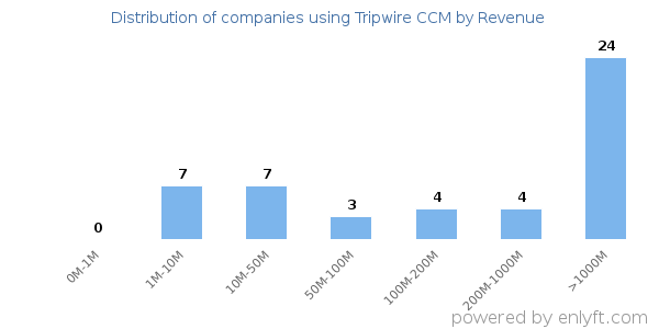 Of all the customers that are using Tripwire CCM, a majority (53%) are large (>$1000M), 26% are small (<$50M) and 6% are medium-sized.