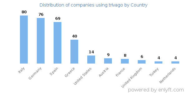 We have data on 358 companies that use trivago. The companies using trivago are most often found in Italy and in the Hospitality industry. trivago is most often used by companies with 1-10 employees and 1M-10M dollars in revenue. Our data for trivago usage goes back as far as 5 years and 2 months.