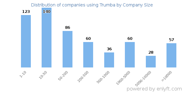 We have data on 643 companies that use Trumba. The companies using Trumba are most often found in United States and in the Education Management industry. Trumba is most often used by companies with 10-50 employees and 1M-10M dollars in revenue. Our data for Trumba usage goes back as far as 9 years and 2 months.