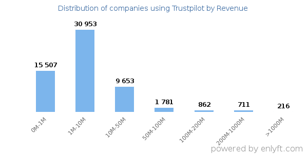 Of all the customers that are using Trustpilot, a majority (70%) are small (<$50M), 7% are large (>$1000M) and 15% are medium-sized.