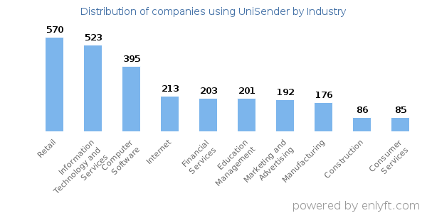 Looking at UniSender customers by industry, we find that Retail (6%) and Information Technology and Services (5%) are the largest segments.