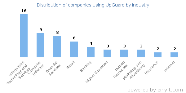 Looking at UpGuard customers by industry, we find that Information Technology and Services (16%), Computer Software (9%), Financial Services (7%) and Retail (5%) are the largest segments.