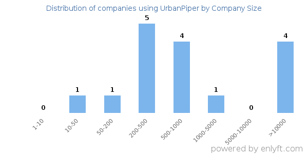 We have data on 16 companies that use UrbanPiper. The companies using UrbanPiper are most often found in India and in the Internet industry. UrbanPiper is most often used by companies with 200-500 employees and 50M-100M dollars in revenue. Our data for UrbanPiper usage goes back as far as 2 years and 4 months.