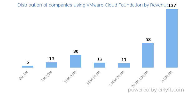 We have data on 273 companies that use VMware Cloud Foundation. The companies using VMware Cloud Foundation are most often found in United States and in the Information Technology and Services industry. VMware Cloud Foundation is most often used by companies with >10000 employees and >1000M dollars in revenue. Our data for VMware Cloud Foundation usage goes back as far as 2 years and 7 months.