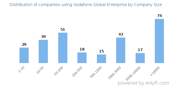 We have data on 286 companies that use Vodafone Global Enterprise. The companies using Vodafone Global Enterprise are most often found in United States and in the Telecommunications industry. Vodafone Global Enterprise is most often used by companies with >10000 employees and >1000M dollars in revenue. Our data for Vodafone Global Enterprise usage goes back as far as 9 years and 1 months.