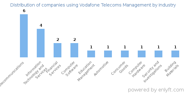 We have data on 21 companies that use Vodafone Telecoms Management. The companies using Vodafone Telecoms Management are most often found in United States and in the Telecommunications industry. Vodafone Telecoms Management is most often used by companies with >10000 employees and >1000M dollars in revenue. Our data for Vodafone Telecoms Management usage goes back as far as 9 years and 1 months.