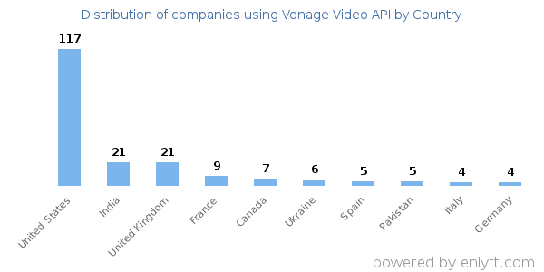 We have data on 237 companies that use Vonage Video API. The companies using Vonage Video API are most often found in United States and in the Information Technology and Services industry. Vonage Video API is most often used by companies with 10-50 employees and 1M-10M dollars in revenue. Our data for Vonage Video API usage goes back as far as 3 years and 11 months.