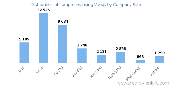 We have data on 39,997 companies that use Vue.js. The companies using Vue.js are most often found in United States and in the Information Technology and Services industry. Vue.js is most often used by companies with 10-50 employees and 1M-10M dollars in revenue. Our data for Vue.js usage goes back as far as 4 years and 6 months.