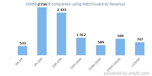 We have data on 9,581 companies that use WatchGuard. The companies using WatchGuard are most often found in United States and in the Information Technology and Services industry. WatchGuard is most often used by companies with 50-200 employees and 1M-10M dollars in revenue. Our data for WatchGuard usage goes back as far as 10 years and 1 months.