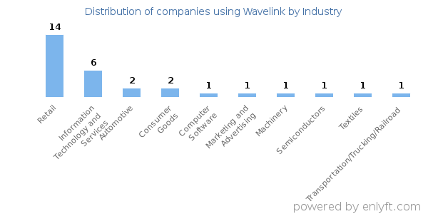 We have data on 34 companies that use Wavelink. The companies using Wavelink are most often found in United States and in the Retail industry. Wavelink is most often used by companies with >10000 employees and >1000M dollars in revenue. Our data for Wavelink usage goes back as far as 10 years and 1 months.