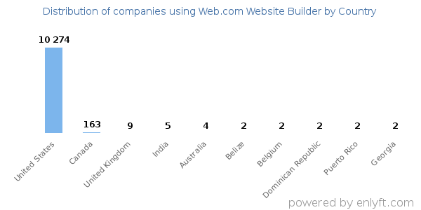 We have data on 10,930 companies that use Web.com Website Builder. The companies using Web.com Website Builder are most often found in United States and in the Construction industry. Web.com Website Builder is most often used by companies with 1-10 employees and 1M-10M dollars in revenue. Our data for Web.com Website Builder usage goes back as far as 8 years and 10 months.