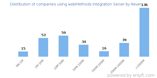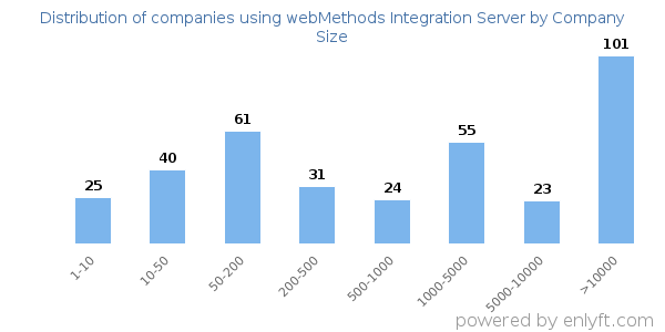 We have data on 367 companies that use webMethods Integration Server. The companies using webMethods Integration Server are most often found in United States and in the Information Technology and Services industry. webMethods Integration Server is most often used by companies with >10000 employees and >1000M dollars in revenue. Our data for webMethods Integration Server usage goes back as far as 3 years and 4 months.