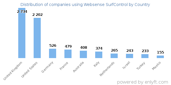 26% of Websense SurfControl customers are in United Kingdom, 21% are in United States and 5% are in Germany.