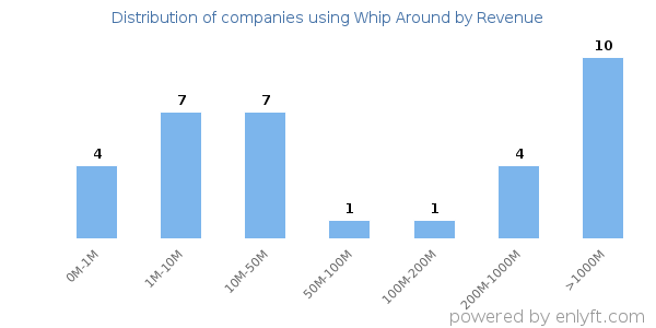 Of all the customers that are using Whip Around, 45% are small (<$50M), 0% are medium-sized and 36% are large (>$1000M).