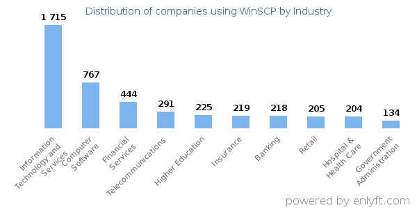 We have data on 7,192 companies that use WinSCP. The companies using WinSCP are most often found in United States and in the Information Technology and Services industry. WinSCP is most often used by companies with >10000 employees and >1000M dollars in revenue. Our data for WinSCP usage goes back as far as 8 years and 3 months.