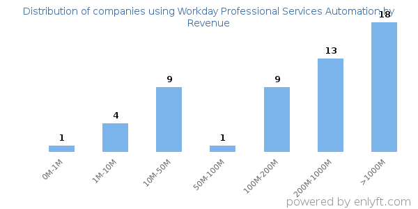 We have data on 63 companies that use Workday Professional Services Automation. The companies using Workday Professional Services Automation are most often found in United States and in the Information Technology and Services industry. Workday Professional Services Automation is most often used by companies with 1000-5000 employees and >1000M dollars in revenue. Our data for Workday Professional Services Automation usage goes back as far as 8 years.