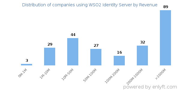 We have data on 252 companies that use WSO2 Identity Server. The companies using WSO2 Identity Server are most often found in United States and in the Information Technology and Services industry. WSO2 Identity Server is most often used by companies with >10000 employees and >1000M dollars in revenue. Our data for WSO2 Identity Server usage goes back as far as 8 years and 6 months.