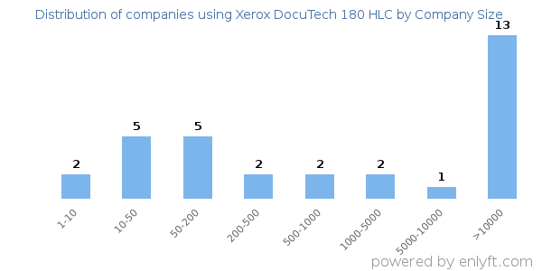 Of all the customers that are using Xerox DocuTech 180 HLC, 17% are small (<50 employees), 21% are medium-sized and 42% are large (>1000 employees).