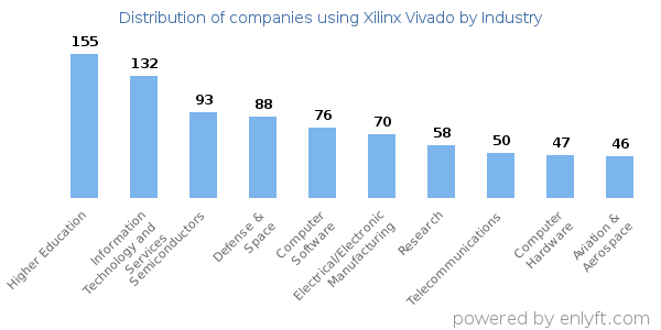Looking at Xilinx Vivado customers by industry, we find that Higher Education (13%), Information Technology and Services (11%), Semiconductors (8%), Defense & Space (7%), Computer Software (6%) and Electrical/Electronic Manufacturing (6%) are the largest segments.