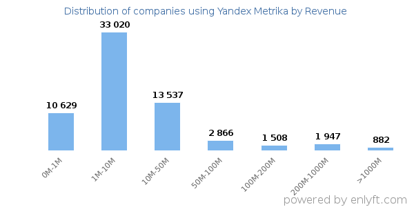 Of all the customers that are using Yandex Metrika, a majority (59%) are small (<$50M), 10% are large (>$1000M) and 21% are medium-sized.